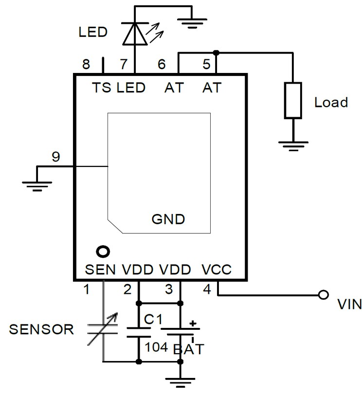 EC0059HDB 采用 ASIC 设计,不会有 MCU 方案的死机现象,也不会出现因低于临界电压而引起的芯片无法复位现象;EC0059HDB 集成了咪头传感检测,支持咪头直接输入,咪头检测经过抗干扰处理,避免误触发;芯片内部集成了 MOSFET 放电开关,吸烟时雾化片的最大电流可超过 6A,PCB 板散热较好情况下可以支持阻抗低至 0.8 欧姆的发热丝;该芯片工作状态稳定,并带有发热丝短路保护功能,在负载电阻小于 0.4Ohm(Typ.)时输出截止;省电模式下静态电流只有 2.2uA(Typ.)。